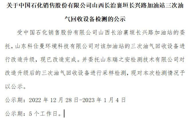 关于中国石化销售股份有限公司山西长治襄垣长兴路加油站三次油气回收设备检测的公示